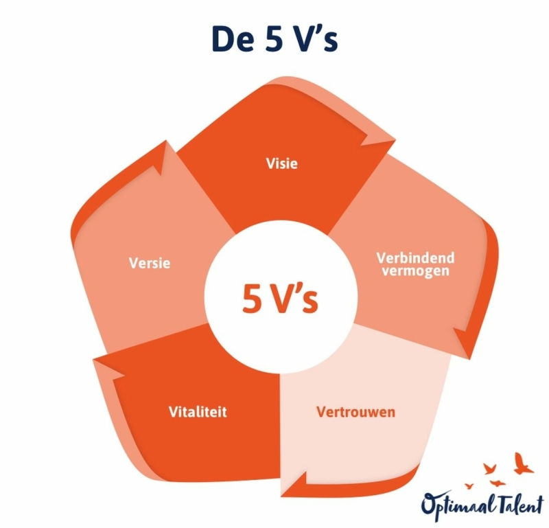 Binnen Optimaal Talent werken wij met een helder en praktisch leiderschapskompas: de vijf V’s van coachend leiderschap. Dit model helpt leiders om scherp te reflecteren op hun gedrag, hun invloed en hun voorbeeldrol.